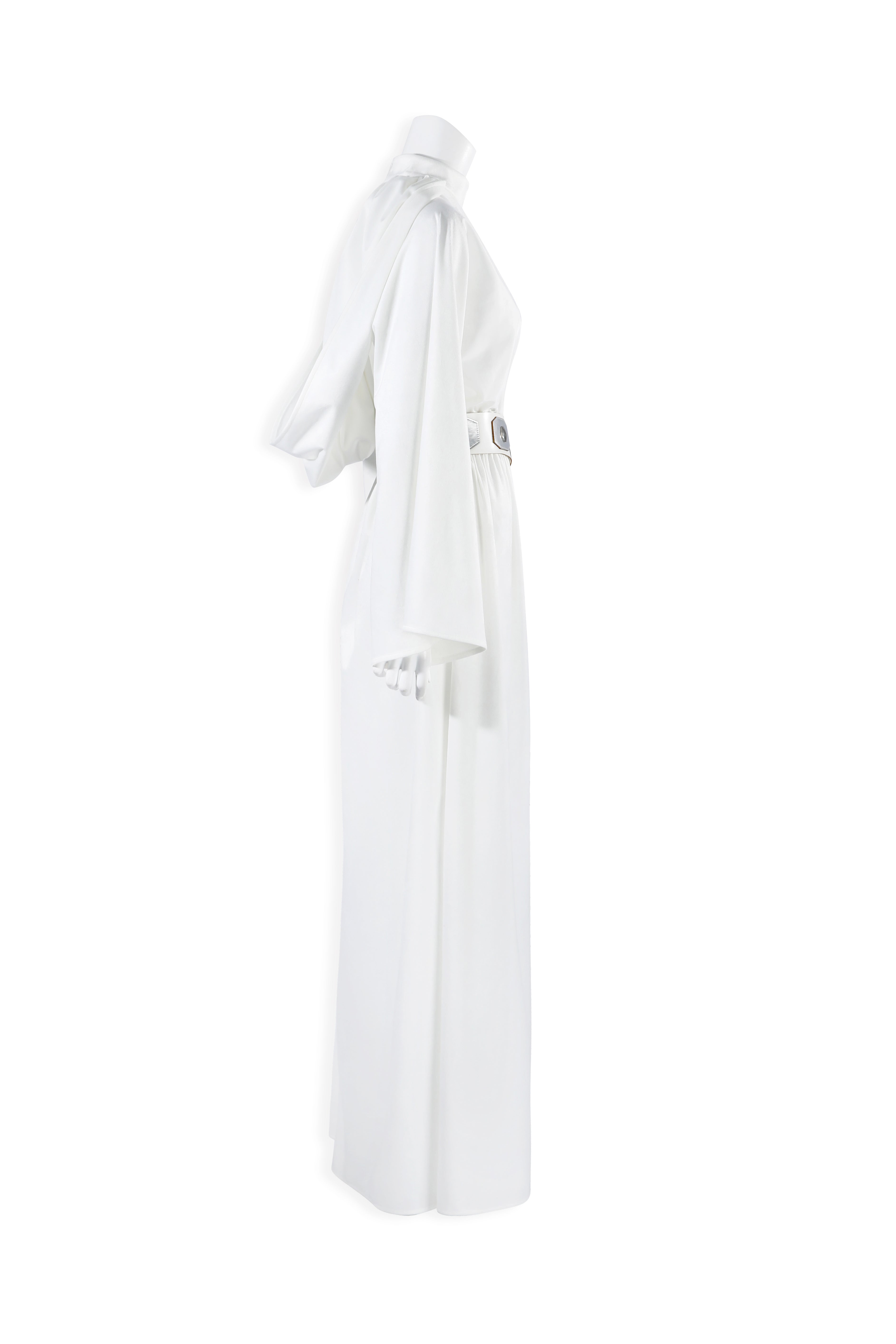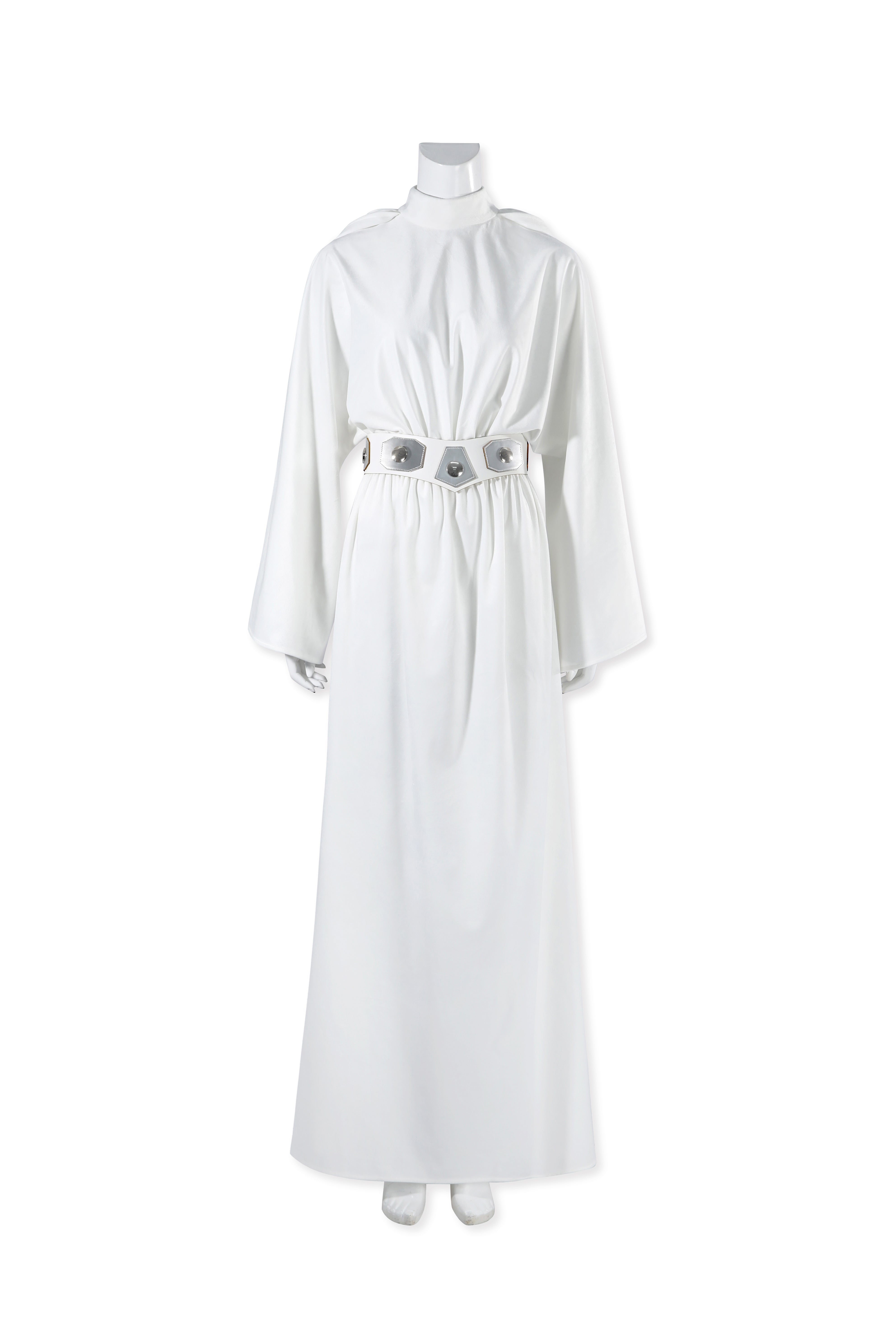 This is a premium, screen-accurate reproduction of the iconic white hooded robe worn by Princess Leia Organa in Star Wars: A New Hope. The complete set includes the detailed tunic dress, the signature hooded robe, and an authentic belt. Crafted from high-quality fabrics for an authentic look and feel.