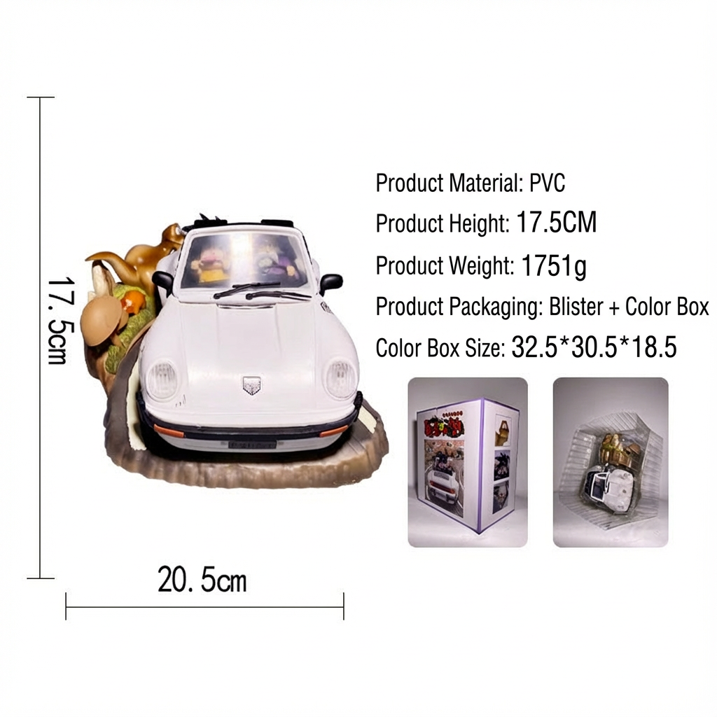 The figurine features highly detailed sculpting of the character expressions, the Porsche 911 model, and dynamic poses. Made from high-quality PVC and ABS materials, it boasts vibrant paint application. The base provides stable support for the lively scene.