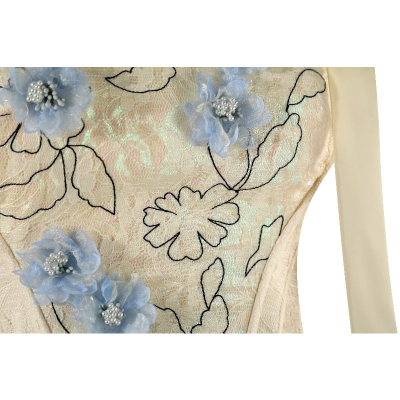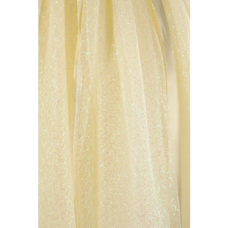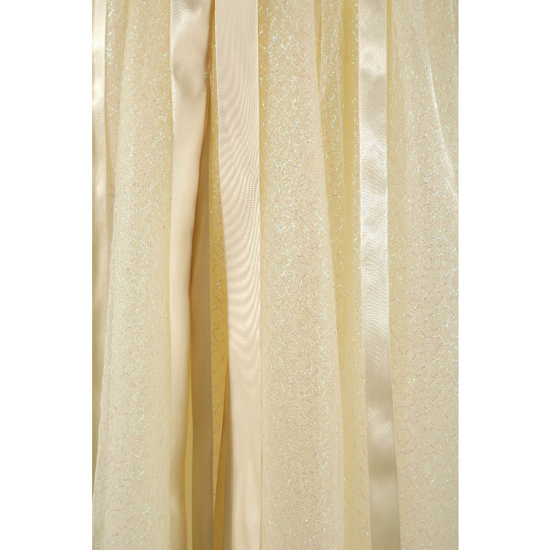 To preserve its elegant appearance, we recommend dry cleaning only. Store the dress in a cool, dry place away from direct sunlight. Handle with care to avoid snags on the delicate fabrics.